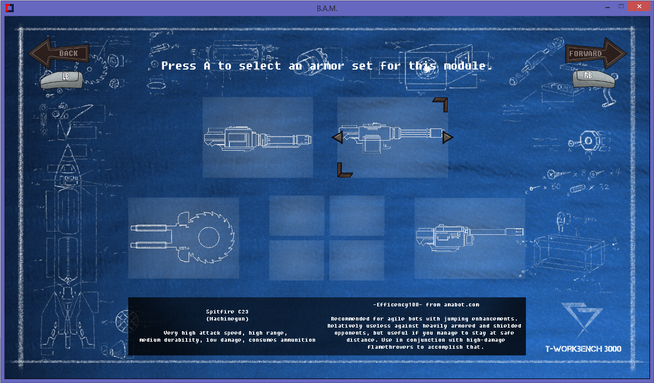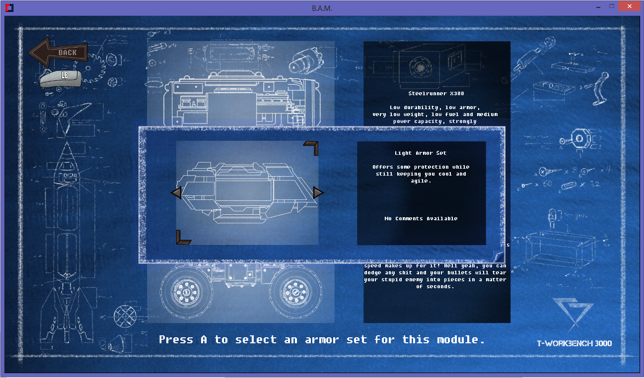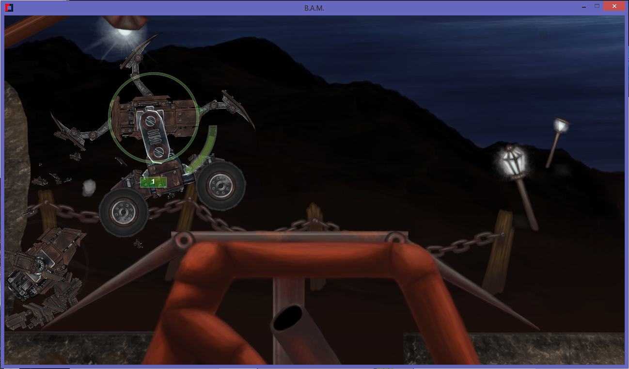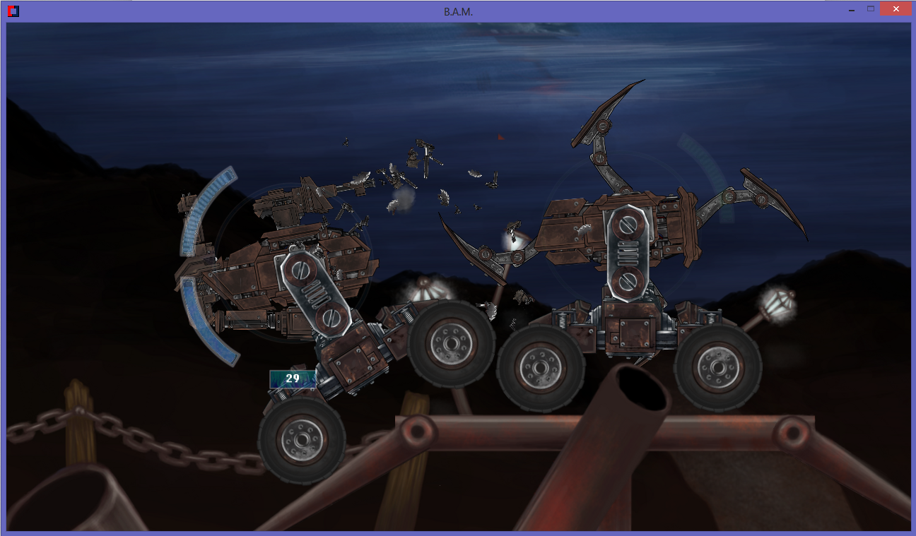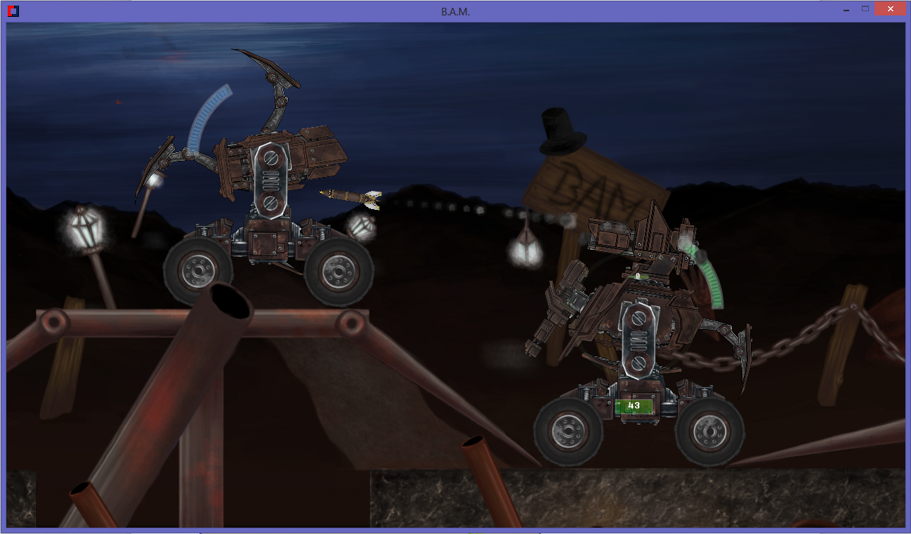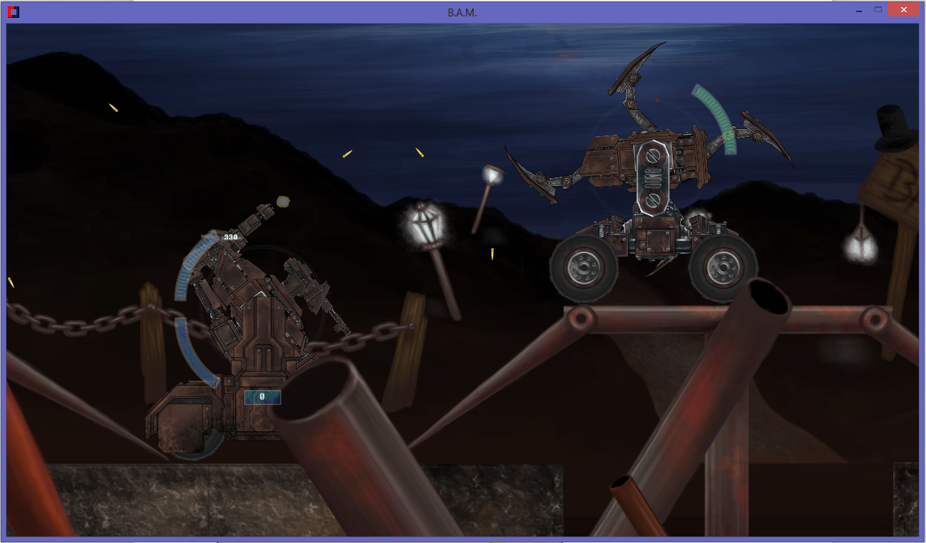 Anyway, what IS B.A.M.? It’s a 2D beat ’em up, featuring fully customizable robots. That means, you can decide from which parts to build your robot to best suit your playstyle and then send it to the arena to send the scraps flying against other robots.
