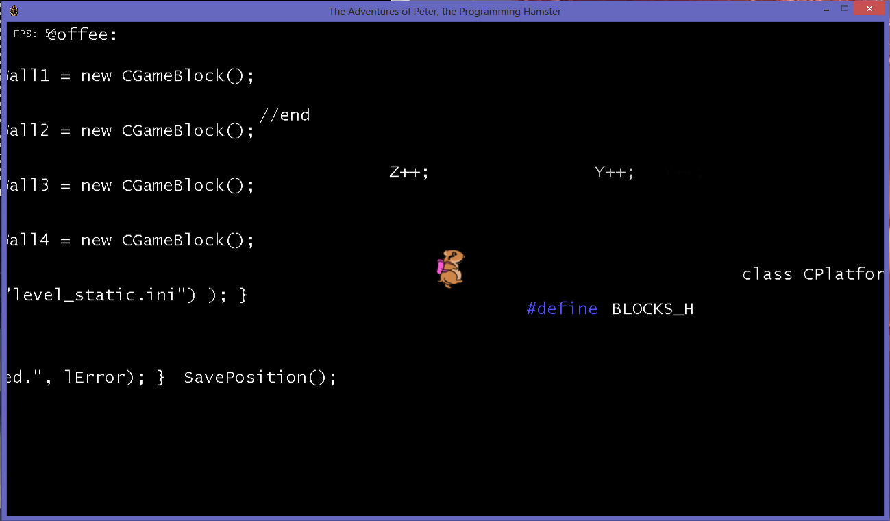 This little sidescrolling jump’n’run is the first game I made using my cengine. In the game, you take control of Peter, a slightly chubby hamster jumping through a world of scary code in his epic quest to find coffee.